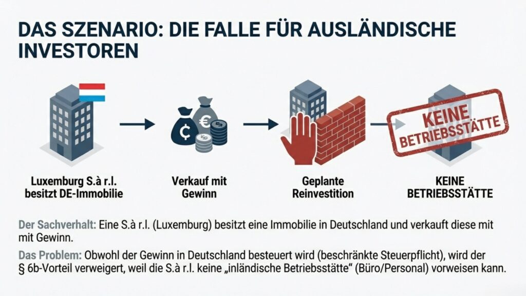 Die Gewährung einer Steuerstundung durch den § 6b EStG ist an eine spezifische Voraussetzung geknüpft: Die veräußerten Anlagegüter müssen zum Zeitpunkt des Verkaufs mindestens sechs Jahre ununterbrochen zum Anlagevermögen einer inländischen Betriebsstätte gehört haben.